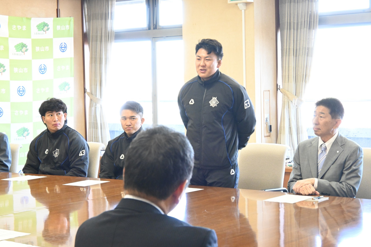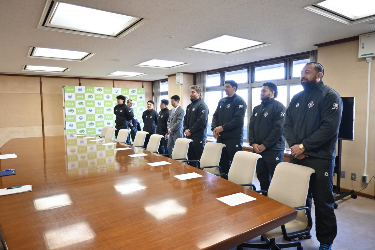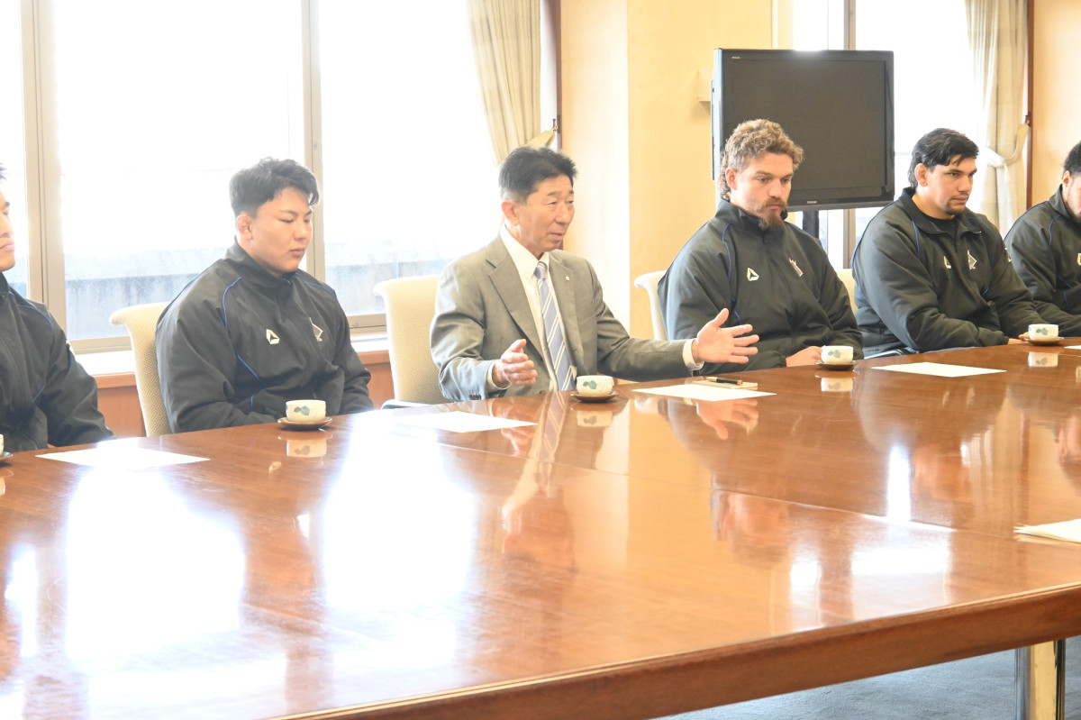 新シーズンへの決意を表明するため、ラグビー部部長の山中善紀氏や運営統括の海老沢洋氏に加え、飯田光紀キャプテン、髙島理久也、水谷健人の両バイスキャプテンら、そして今シーズンから新たに加わった外国人選手を含むメンバーが狭山市役所を訪れた。