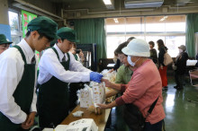 当日は、スイートポテトパンとコーングラタンパンの2種類、計180個を用意、1年生3人が販売を担当。販売時間前から地域住民が並び、3人は「いらっしゃいませ」「ありがとうとざいます」と声をかけながら、笑顔で対応した。