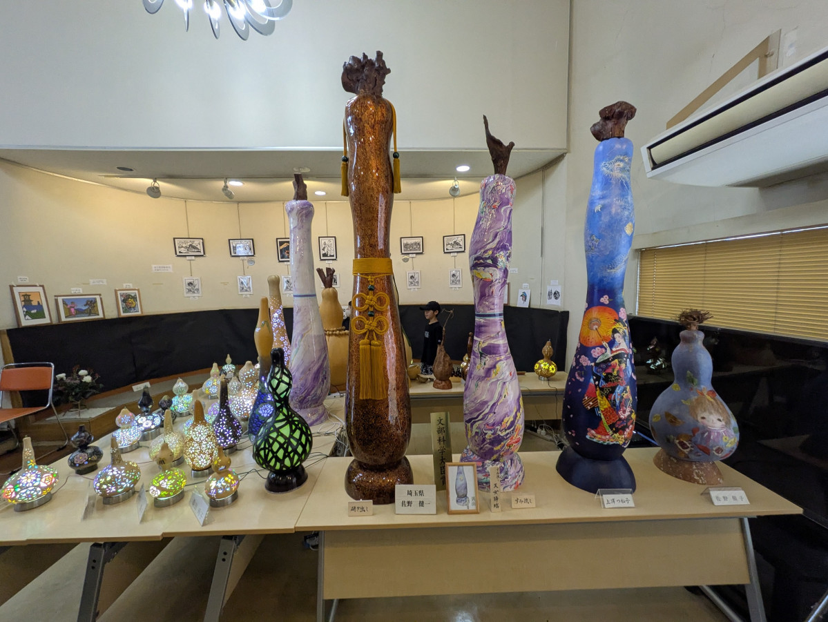 佐野さんは堀兼在住のひょうたん作家で、6月に福井県福井市で開かれた同大会で、記念すべき第50回を迎えた節目の年に最高賞である文部科学大臣賞を受賞。今回の展示は、狭山市民文化祭に合わせて開催するもので、受賞作をはじめとする数々の作品を展示した。