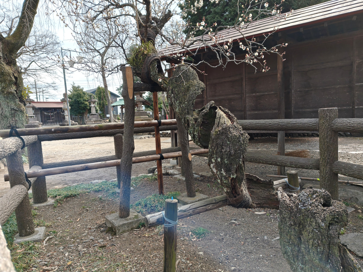 狭山の広瀬神社(狭山市広瀬2)で現在、ねじれた幹が特徴の梅「不朽梅(ふきゅうばい)」が見頃を迎えている。