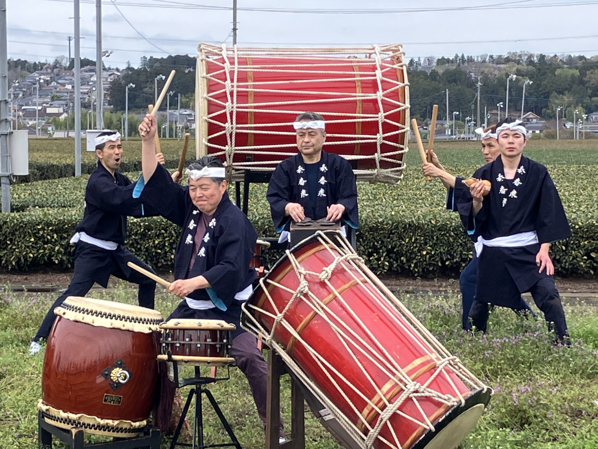 茶畑で太鼓を披露する田中製茶園代表の田中信夫さん(手前)