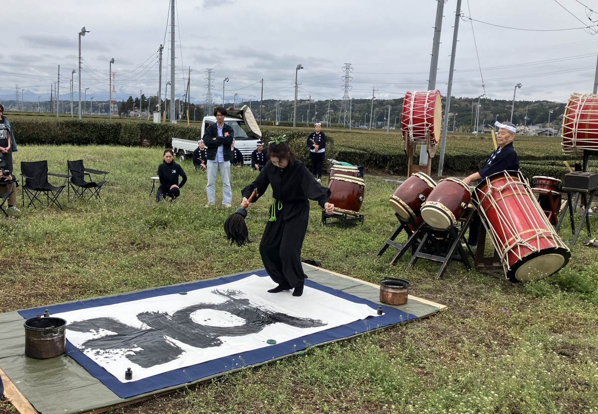 書家・若林英子さんによる茶畑での揮毫(きごう)